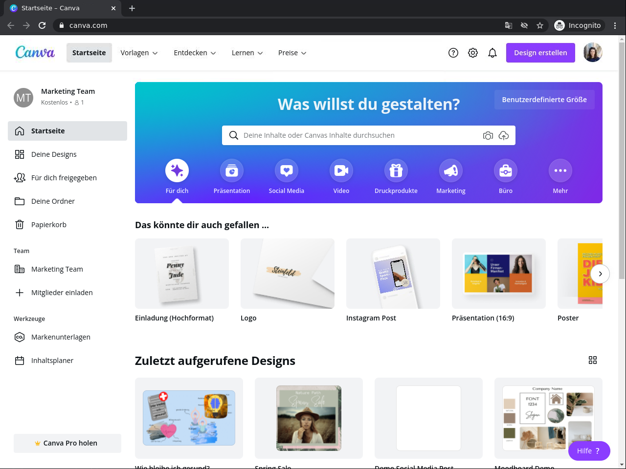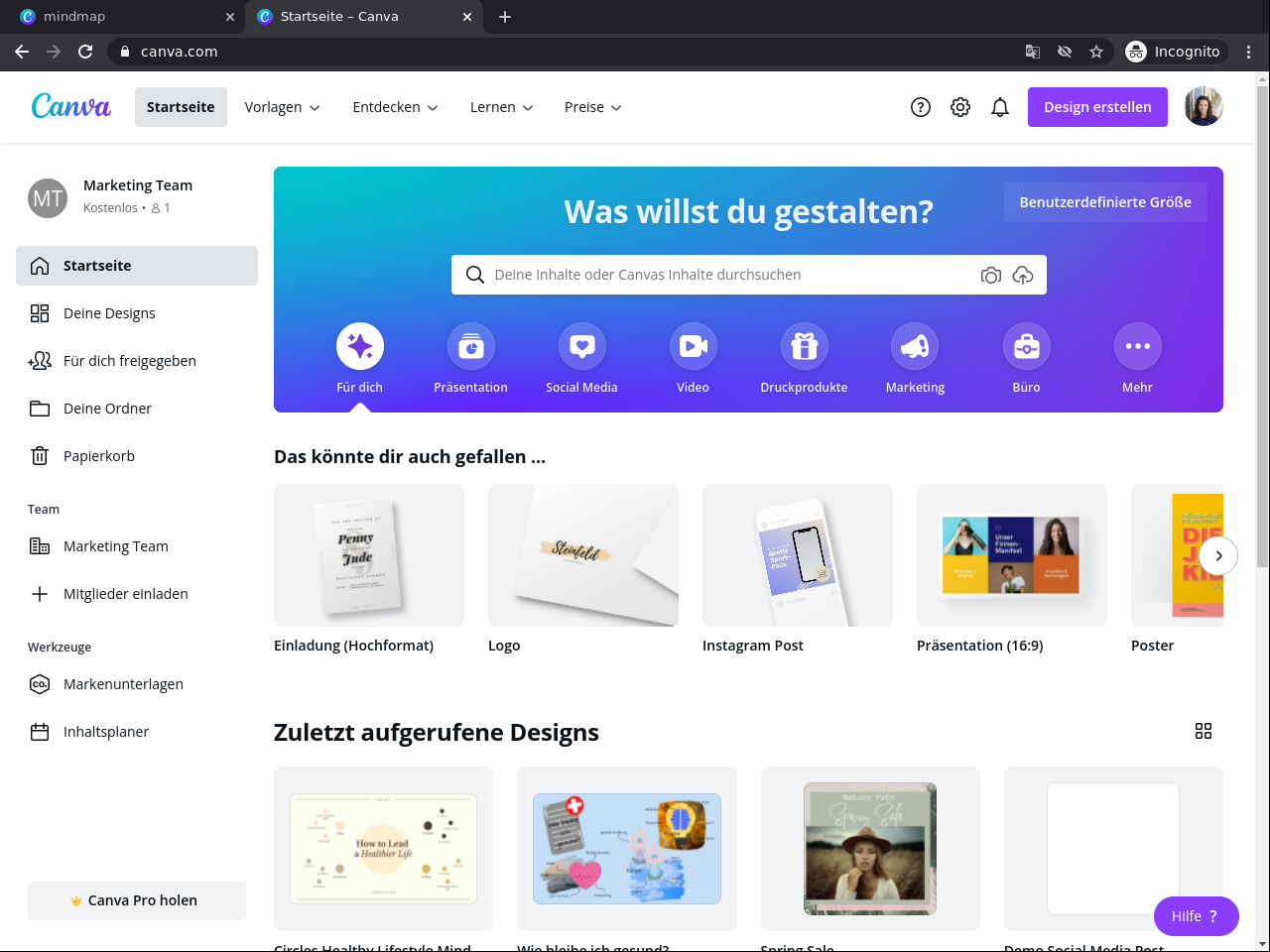 1. Erstelle einen Canva Account und erkunde deinen Cava Arbeitsplatz.