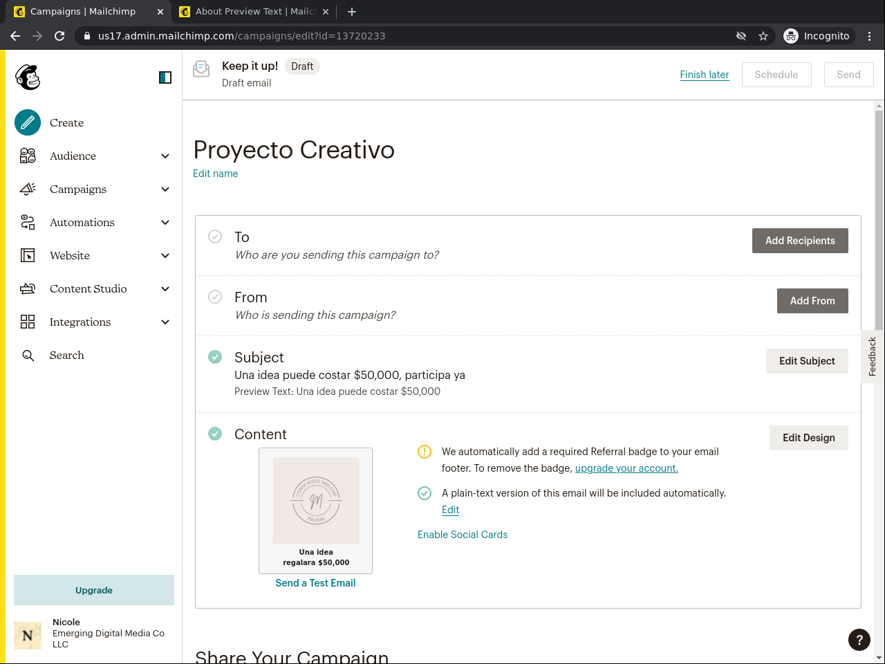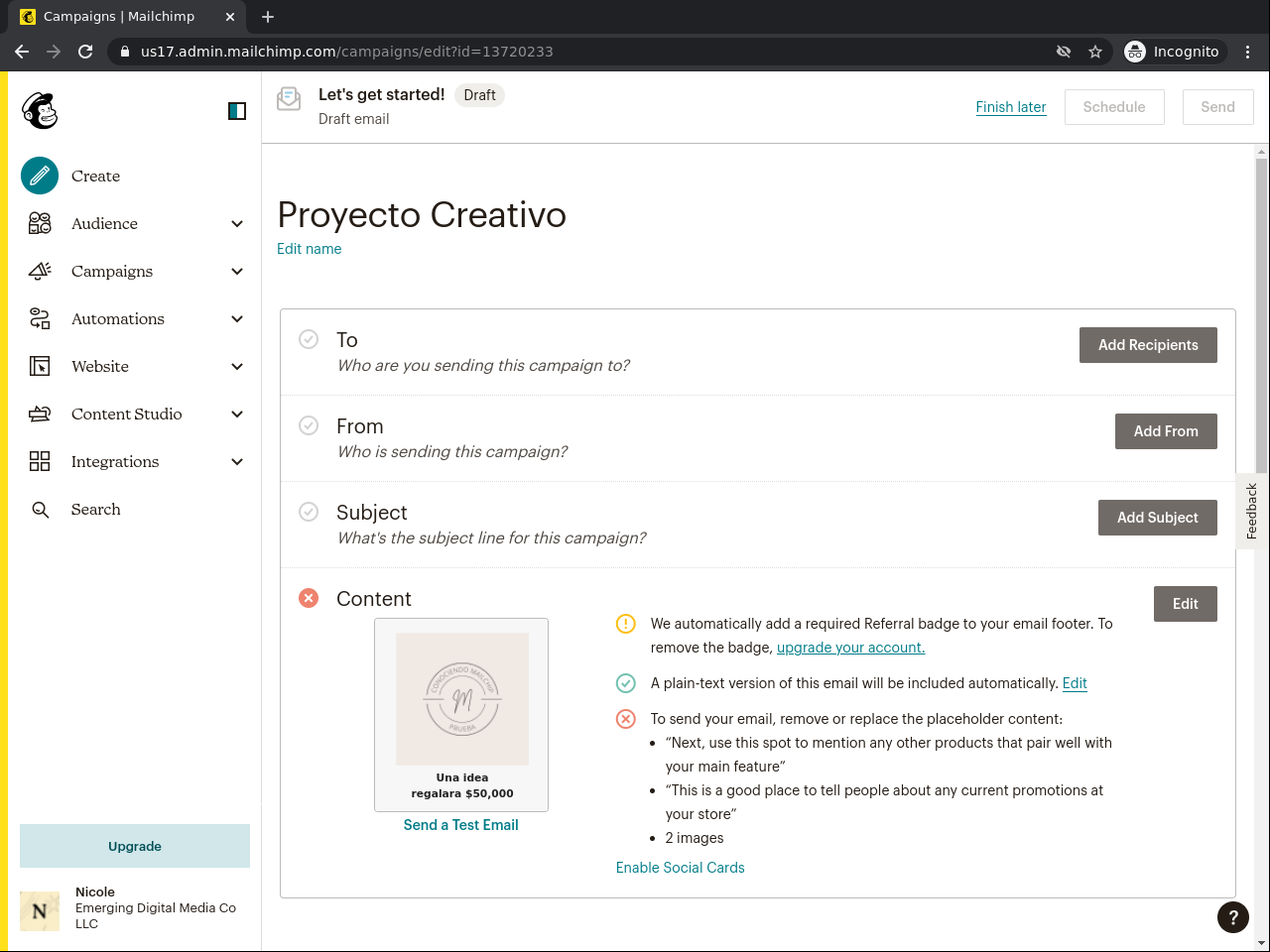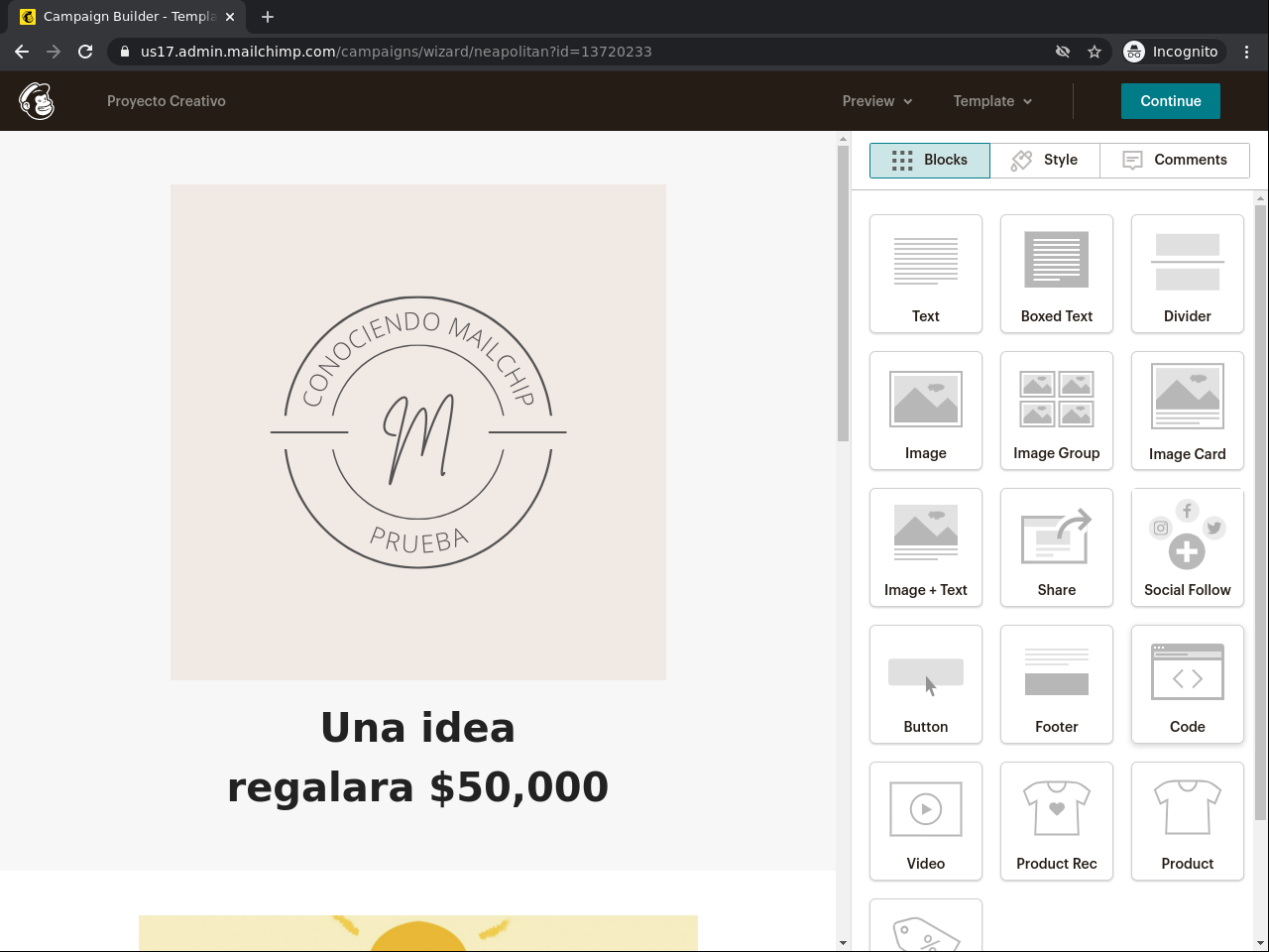 Este proyecto está dedicado a las ideas creativas que deseas desarrollar y explotar en diferentes campos. En él aprenderá sobre cómo desarrollar un resumen creativo en Mailchimp. Mailchimp es un acceso a través de una web que contiene diferentes herramientas para campañas publicitarias o de mercadeo. Este proyecto le permitirá organizar sus ideas para campañas publicitarias, mercadeo o simple, si usted tiene un blog, podcast, página web que ofrece productos o servicios, este proyecto es para usted. Porque le ayudará a desarrollar con precisión una investigación para alcanzar mayor cantidad de ventas o audiencia. Este proyecto le mostrará paso a paso cómo crear un resumen creativo y que conlleva, desde seleccionar el tema hasta validar el área demográfica que se impactará con el mismo. Es importante conocer todos estos pasos para identificar correctamente porque no se logró la expectativa o porque la expectativa de venta o alcance se excedió. Haremos varios ejercicios de práctica y veremos como Mailchimp nos guía paso a paso en el proceso. Es una herramienta de paso a paso por lo que si cometemos algún error o queremos regresar a una sección podremos hacerlo. Podremos ver cada sección identificada con el proceso creativo que queremos desarrollar. También ofrece otras herramientas y las podremos ver en el proyecto. Estaré contigo durante el proceso para ofrecerte todo lo que necesitas para explotar esas ideas creativas que quieres desarrollar.